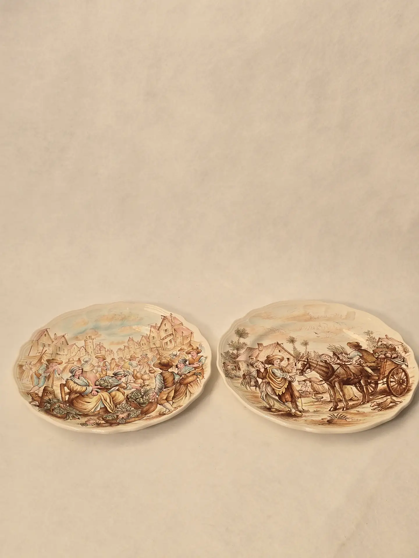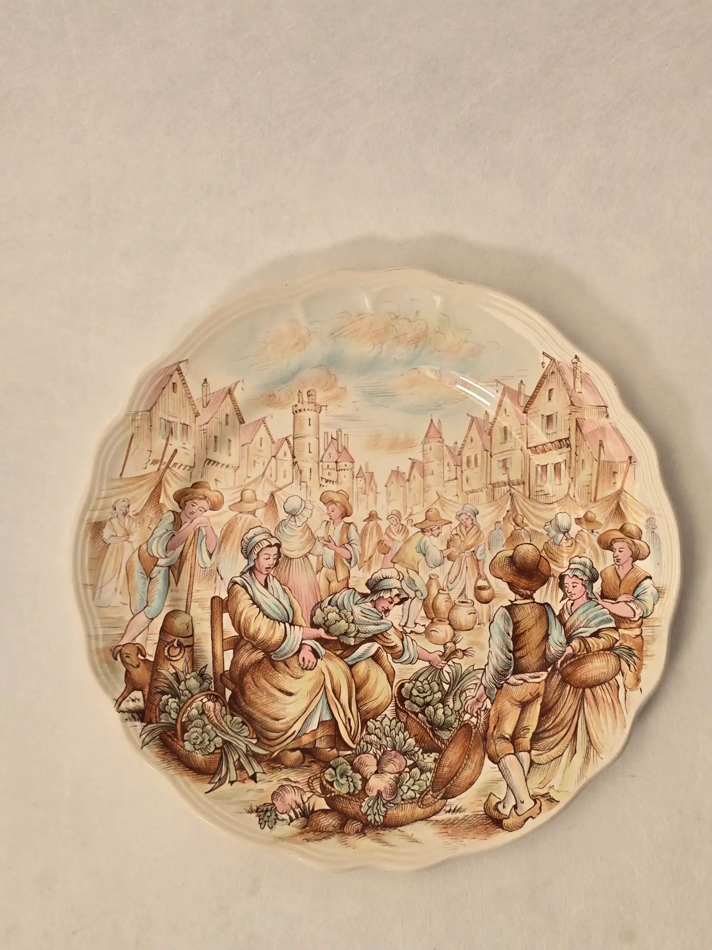 • Assiette n°10 – “Le Marché” : une scène animée illustrant un marché traditionnel, avec architecture ancienne et nombreux personnages.
