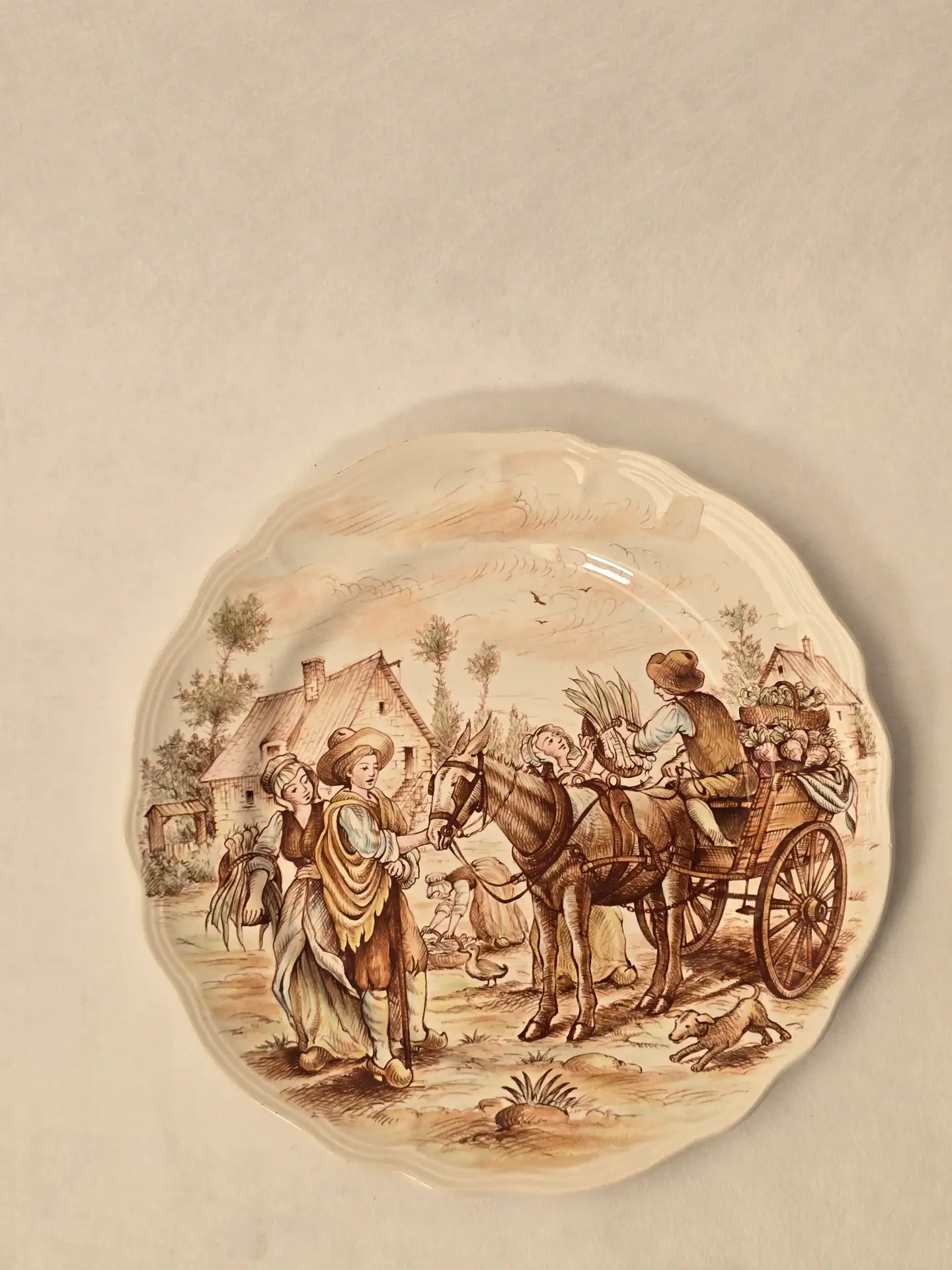 • Assiette n°8 – “La Récolte” : une scène bucolique représentant un moment de repos au village, avec personnages, animaux et charrette.