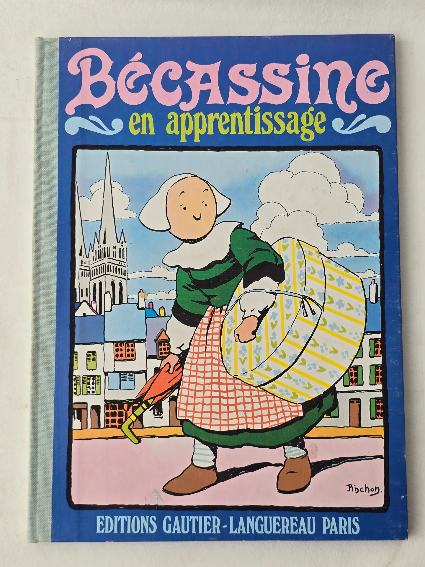 Bécassine en apprentissage (tome 2 de la série) est le deuxième album des aventures hilarantes de la jeune paysanne bretonne naïve. Prépublié en 1914 dans La Semaine de Suzette, édité en album en 1919 par Gautier-Languereau. Votre exemplaire est une réédition 1983 (ISBN 2-217-10002-5), format cartonné 23×31 cm, 62 pages couleur, dos toilé bleu.