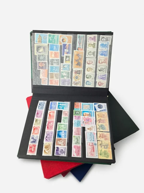 Cet ensemble comprend 5 albums contenant un assortiment varié de timbres issus de plusieurs pays. On y trouve des timbres anciens et plus récents, avec différents thèmes comme les personnages historiques, monuments, transports, aviation, faune, symboles nationaux et scènes de vie. L’ensemble présente une belle diversité visuelle et géographique, ce qui en fait un lot intéressant pour collectionneur, passionné de timbres internationaux ou acheteur à la recherche d’un stock à revendre au détail.