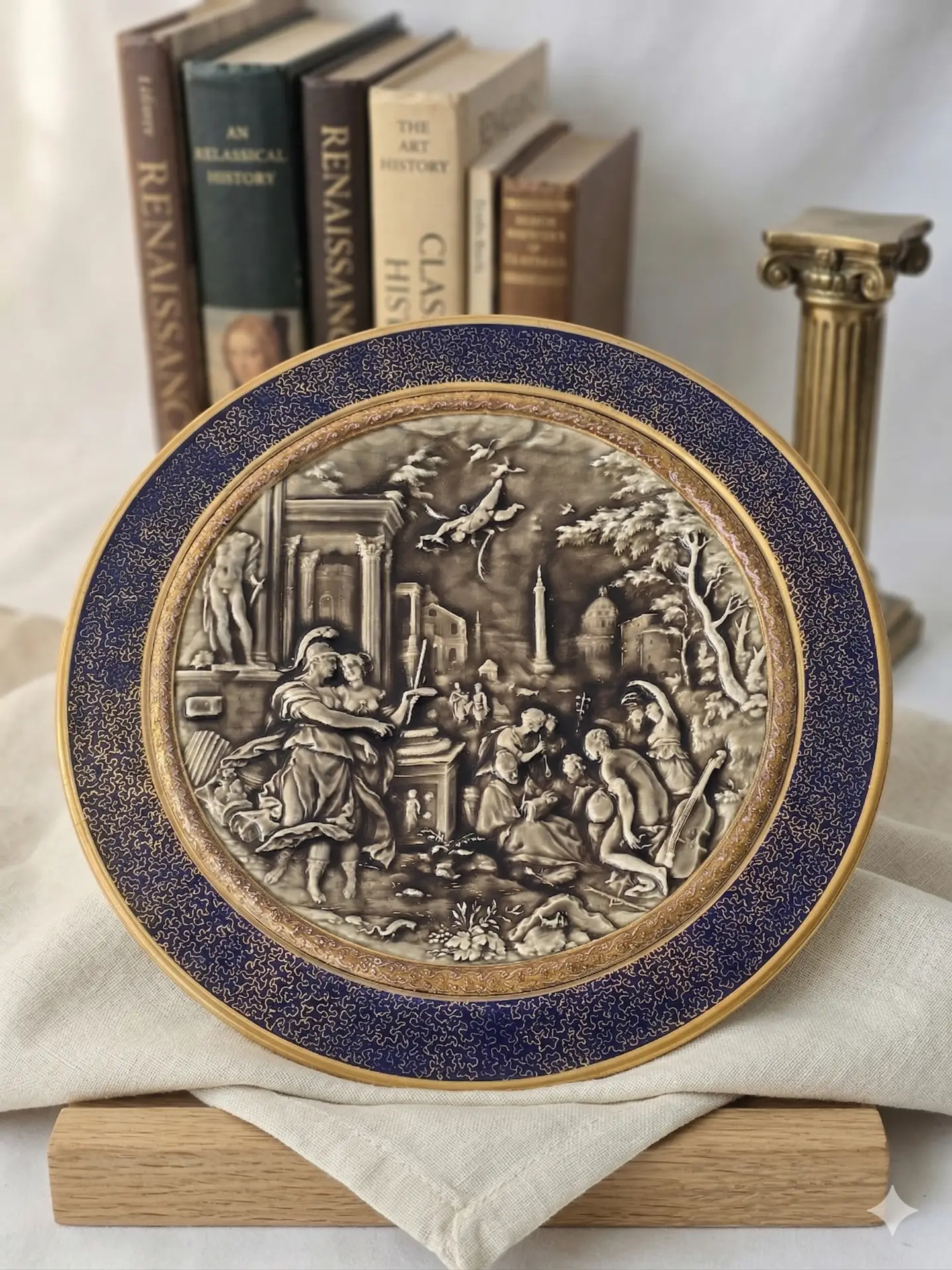 Avec son diamètre de 32 cm, ce modèle se rapproche d’un plat d’apparat ou d’un plat mural plutôt que d’une assiette de service courante. La bordure bleu cobalt à décor ornemental doré accentue son caractère décoratif et collectible.