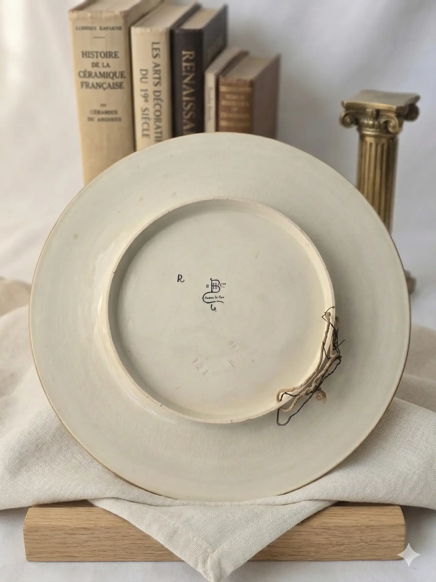 Ce grand plat décoratif ancien est une production de la manufacture HB & Cie Choisy-le-Roi, l’une des grandes faïenceries françaises du XIXe siècle. La marque au revers renvoie à la période Hippolyte Boulenger & Cie, active à Choisy-le-Roi après 1863.