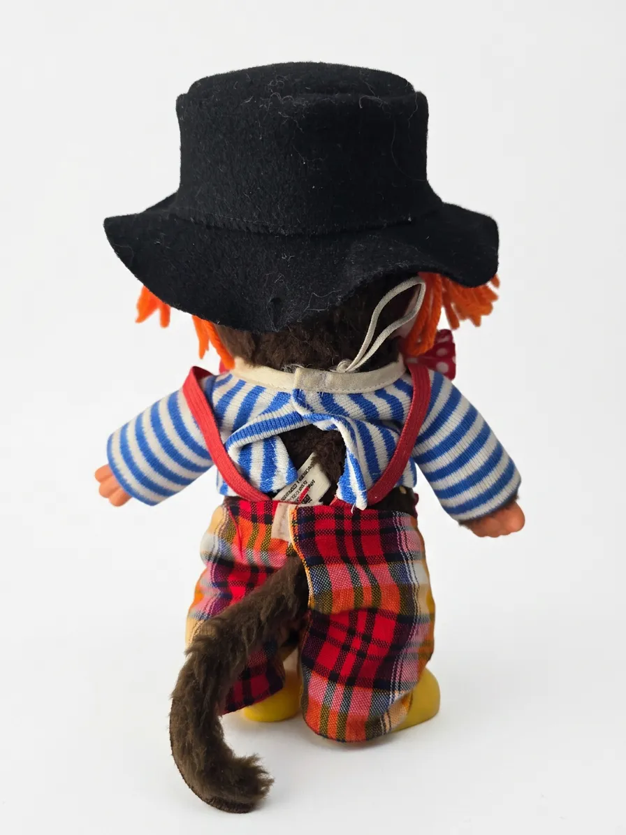 Ce Kiki vintage fabriqué par Sekiguchi dans les années 1970–1980 fait partie des éditions costumées produites en France. Il porte sa tenue complète de clown : pantalon écossais, bretelles rouges, chemise rayée, nœud papillon à pois et chapeau noir.