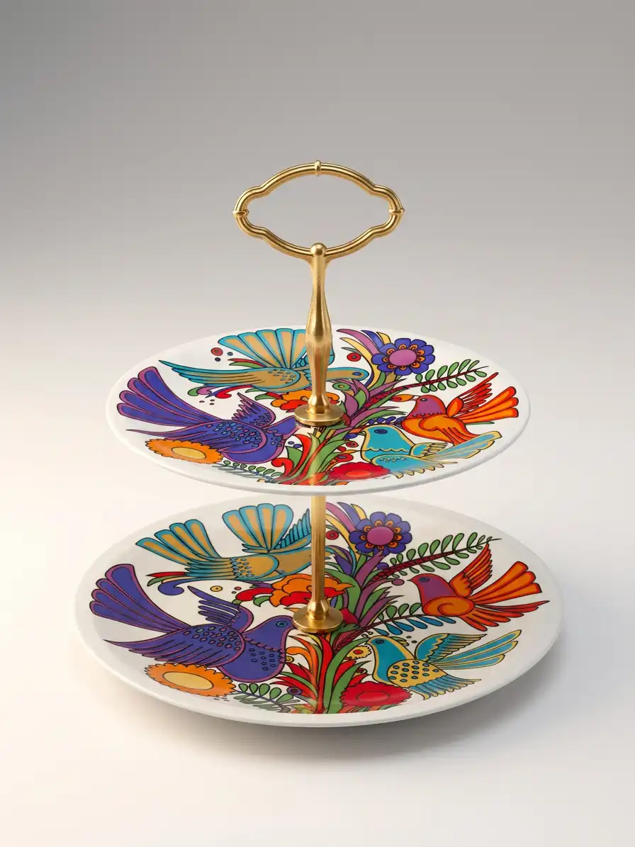 Découvrez ce superbe serviteur 2 étages Villeroy & Boch, issu de la célèbre collection Acapulco, l’un des décors les plus emblématiques de la marque. Créé dans les années 1960 par l’artiste Christine Reuter, Acapulco se distingue par ses couleurs vives, ses oiseaux tropicaux et ses fleurs stylisées inspirées de l’art mexicain.