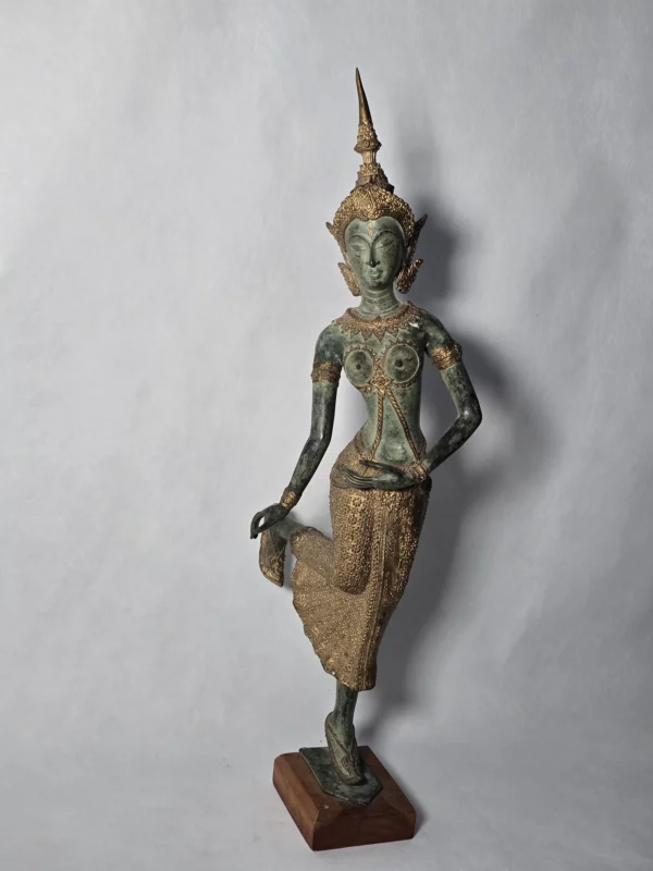 Statue en bronze de danseuse thaïlandaise Apsara – Une figure en bronze d’une « Danseuse Apsara » féminine, avec une patine verdigris et dorée. Montée sur une base en bois.
