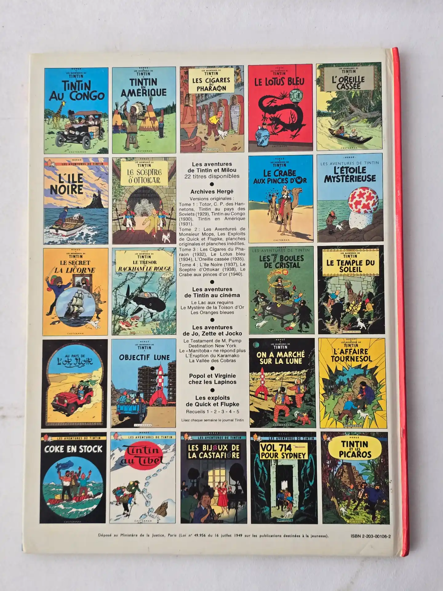 L’exemplaire proposé ici est une réédition Casterman d’octobre 1981, identifiable par sa couverture cartonnée, son dos rouge et l’ISBN 2-203-00106-2 visible au verso. La quatrième de couverture avec mosaïque d’albums Tintin est typique des réimpressions Casterman du début des années 1980.