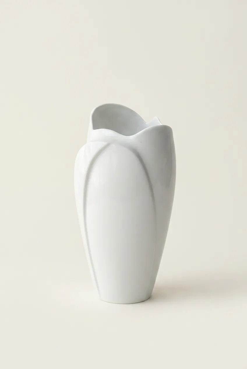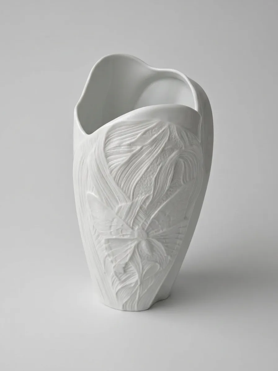Vase en porcelaine blanche de Limoges au décor en relief de feuillages et papillon. Une pièce élégante au style sobre et contemporain, idéale en décoration intérieure ou pour un bouquet léger.