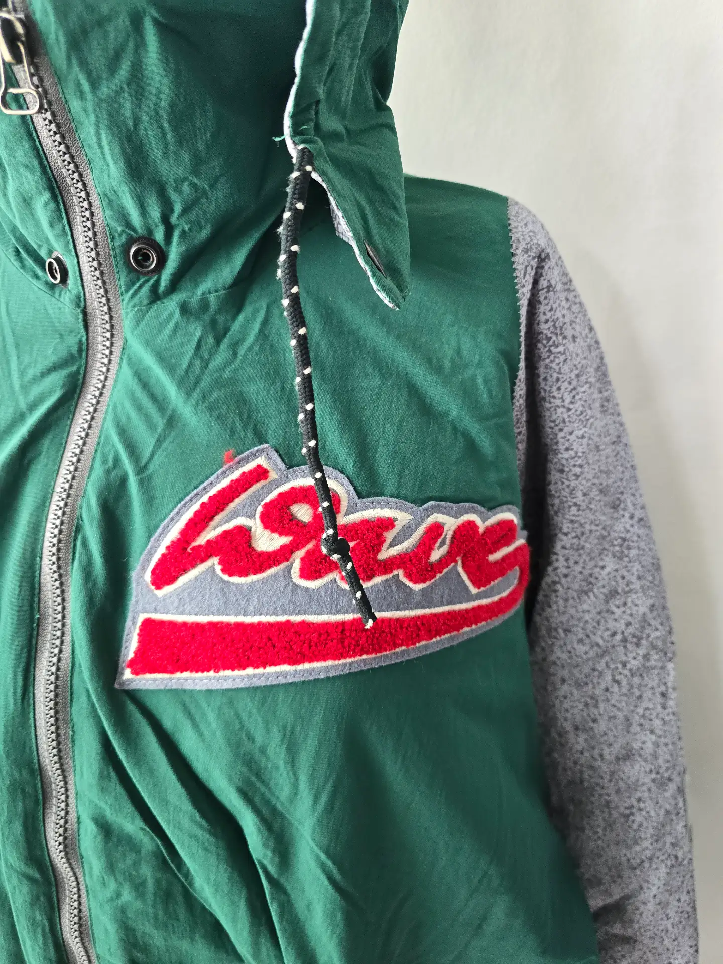 Le modèle présente une fermeture zippée, une capuche intégrée, un corps vert, des manches gris moucheté et de grands patchs brodés sur le devant, pour un look old school très visuel.